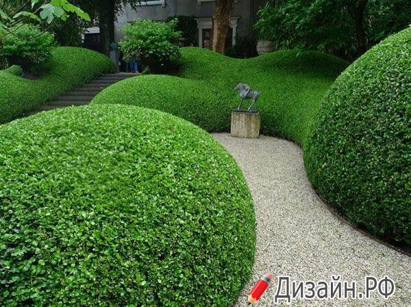 Чтобы минимизировать уход, надо использовать невысокие кустарники, не нуждающиеся в стрижке, или которым достаточно небольшой формовки. Очень хорошо для фитопластики подходят спирея японская, кизильник блестящий, лапчатка кустарниковая, можжевельник казацкий, ива пурпурная ‘Нана’, туя западная ‘Даника’.